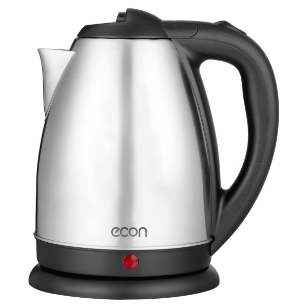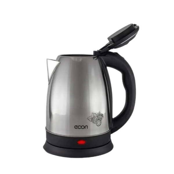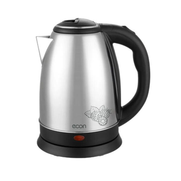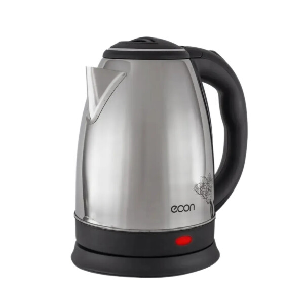 Этот электрический чайник от компании Econ быстро нагреет воду и сам отключится после закипания. Его емкость составляет 1,8 литра, а мощность 1850 Ватт, в качестве нагревательного элемента выступает металлический диск расположенный на дне чайника. Крышка открывается вручную, чайник вращается на 360 градусов относительно подставки. Есть индикация включения чайника, шнур убирается в подставку, также стоит защита от включения при отсутствии воды.