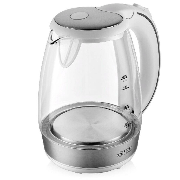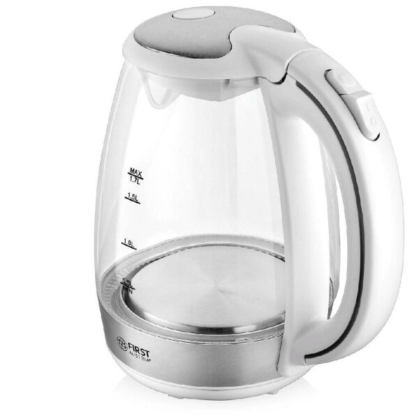 Электрочайник First FA-5404-2-WI потребляет 2200 Вт. Резервуар для воды сделан из закаленного стекла и рассчитан на 1,7 л.