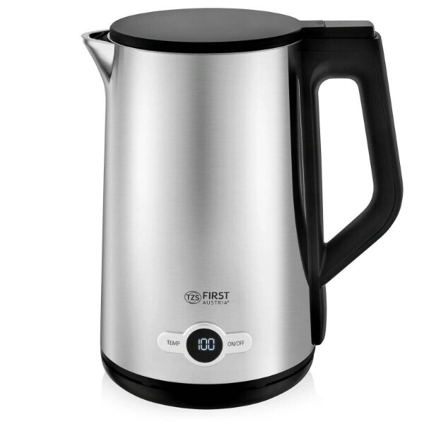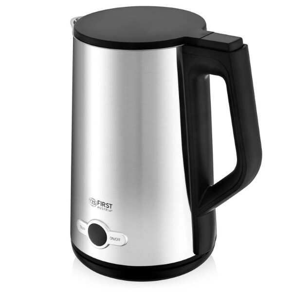 Электрочайник First FA-5407-5 объемом 1,7 л снабжен плоским нагревательным элементом и двойными стенками, надолго удерживающими тепло.