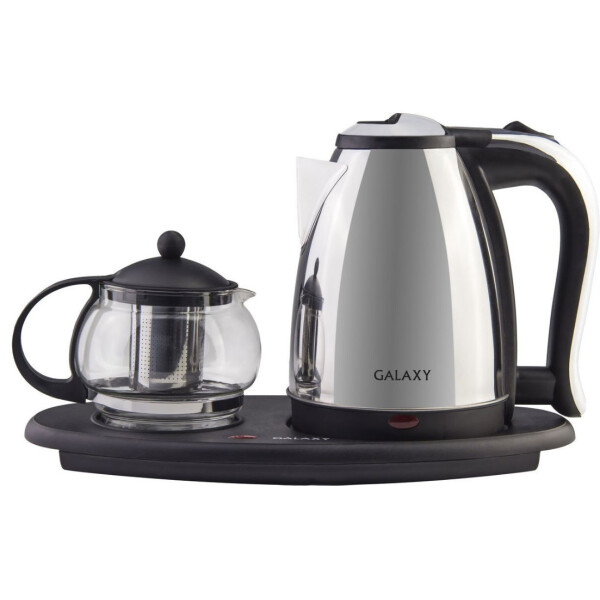 Galaxy GL 0401 это комплект, состоящий из самого электрочайника и заварочного чайника. Корпус электрочайника выполнен из нержавеющей стали, что положительно сказывается на сохранении полезных свойств воды при кипячении, а корпус заварочного чайника состоит из особого стекла, которое прочнее обычного в три раза. Крышки, эргономичные ручки и подставка созданы с использованием термостойкого пластика, что повышает износостойкость комплекта.