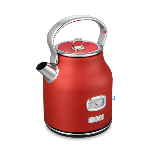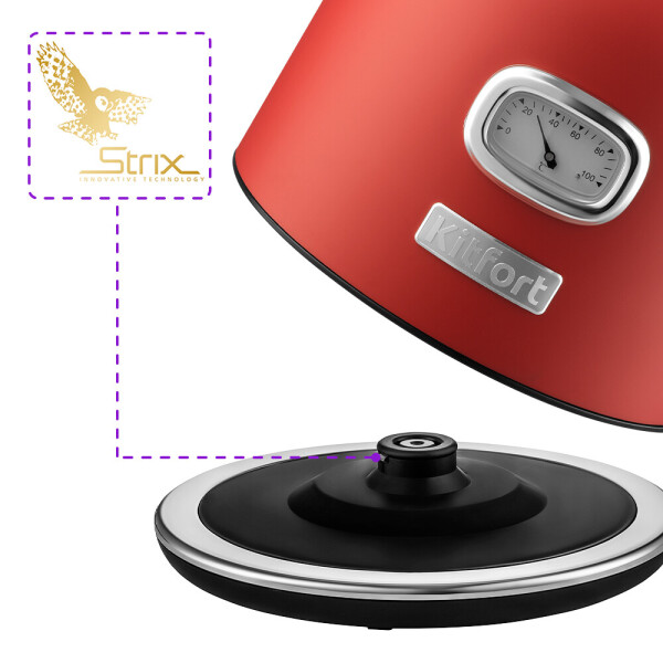 На корпусе чайника установлен термометр, который показывает температуру воды в чайнике. Это удобно, если вы готовите напитки, для которых требуется определенная температура воды, например, зеленый чай, белый чай, кофе и т. д. Принцип работы термометра термомеханический: биметаллическая пластина при изменении температуры деформируется и приводит в движение стрелку термометра. Для корректной работы термометра наполняйте чайник водой выше минимального уровня, чтобы щуп термометра полностью находился в воде.