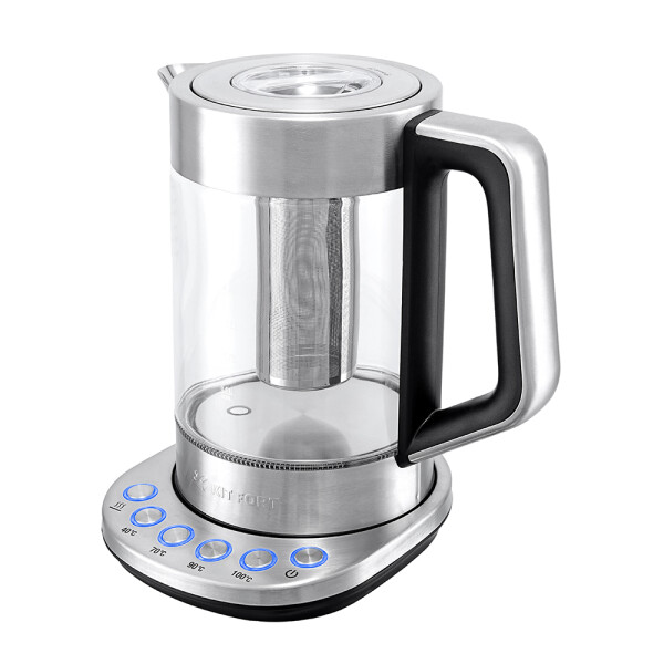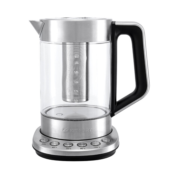 Электрочайник Kitfort КТ-622 очень удобен и функционален, чтобы им можно было пользоваться ежедневно с максимальным комфортом. В чайник помещается 1.7 литров воды, чего вполне достаточно для приготовления чая на несколько человек. Закипает такой объем довольно быстро благодаря мощности в 2000 Вт. При этом, вы сможете установить необходимую температуру закипания. Это даст возможность заваривать различные виды чая. А встроенный заварник позволит делать это одновременно с процедурой кипячения воды.