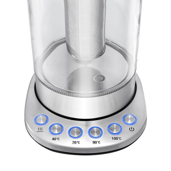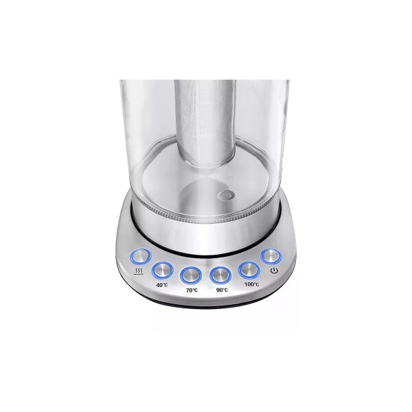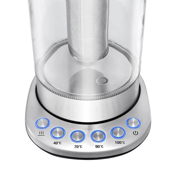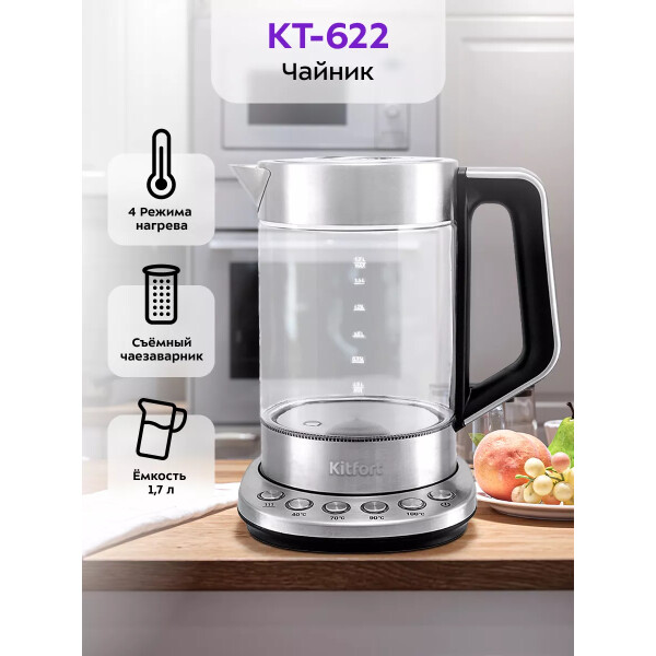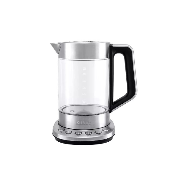 Электрочайник Kitfort КТ-622 имеет электронное управление, кнопки которого размещены на подставке прибора. Конструктивная особенность подставки обеспечивает возможность вращения на ней чайника. У электрочайника прозрачный корпус из термостойкого стекла, который подсвечивается во время работы светодиодной подсветкой. Это создает завораживающий эффект. Специальная технология позволяет поддерживать определенную температуру внутри чайника, чтобы вам не пришлось слишком часто включать его заново. После закипания электрочайник отключается и раздается звуковой сигнал о завершении процесса.