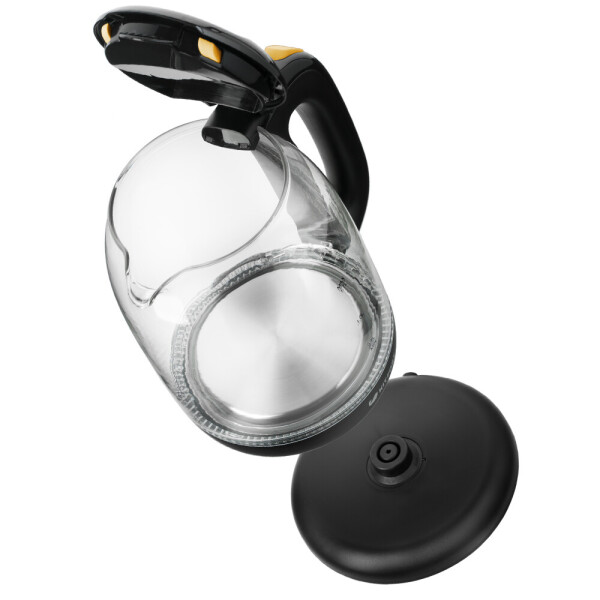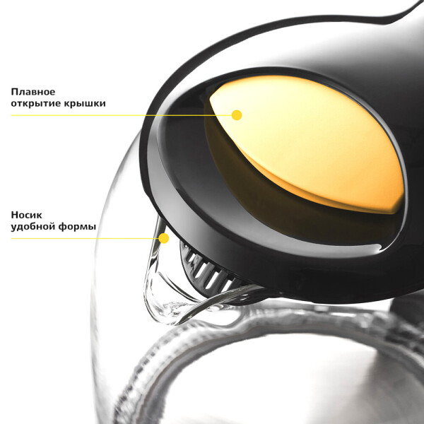 Корпус чайника выполнен из стекла, а крышка и подставка из пластмассы. Мерная шкала нанесена на прозрачную часть корпуса. Большое горлышко чайника облегчает доступ внутрь при мытье и во время удаления накипи. Ручка чайника пластиковая, не нагревается и удобно лежит в руке.