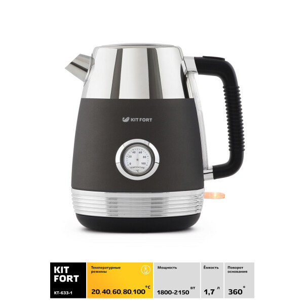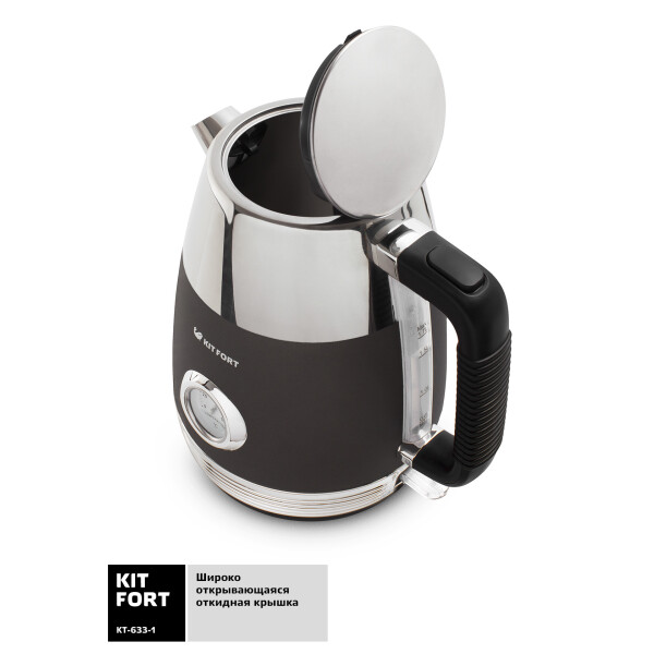 Электрический чайник Kitfort КТ-633 предназначен для кипячения воды дома, в офисах и на дачах. Мощность чайника позволяет использовать его в домах со слабой проводкой. Корпус чайника и подставка выполнен из сочетания металла и пластика, а подставка - из пластика. Мерная шкала находится на корпусе сбоку у ручки.