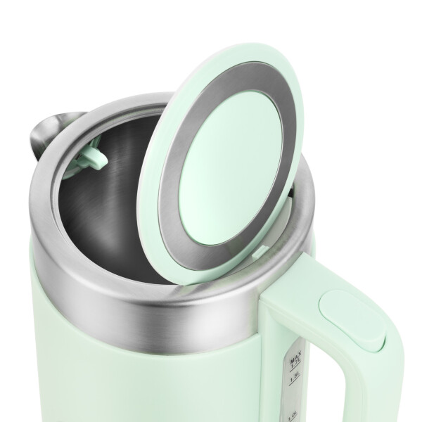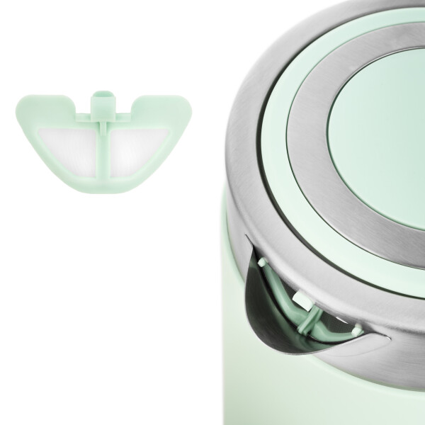 Современная конструкция чайника препятствует образованию накипи, облегчает уход, значительно снижает шум при нагревании воды. Носик чайника оснащён съёмным фильтром, который обеспечивает дополнительную защиту от накипи.