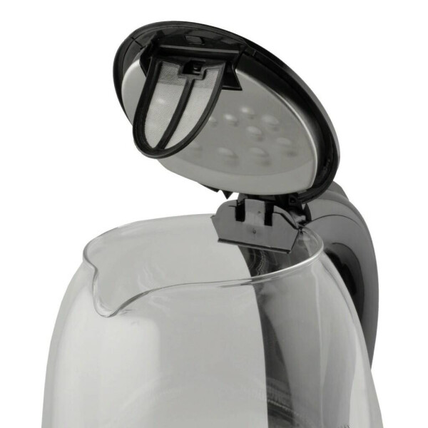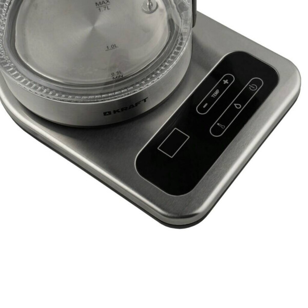 Электрический чайник KRAFT KF-KC1796DP из боросиликатного стекла со вставками из нержавеющей стали и черного пластика имеет мощность 2200 Вт и способен за несколько минут довести до кипения 1,7 л воды.