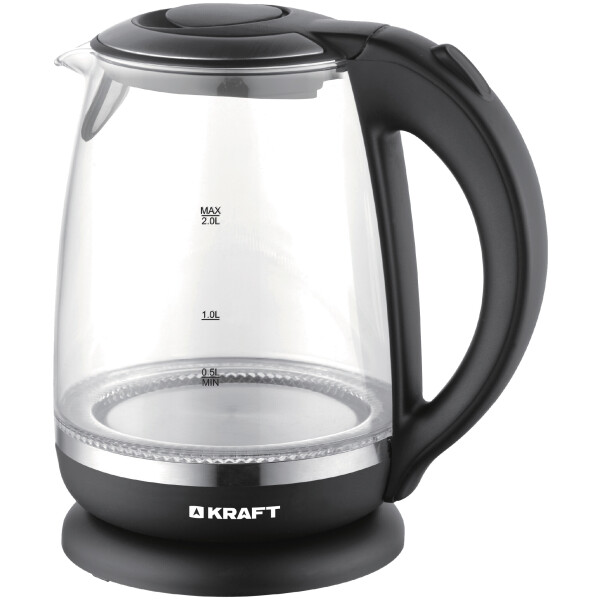 Стеклянный электрический чайник KRAFT KF-KG2018BL выполнен в чёрном цвете, имеет мощность 2200 Вт и способен за несколько минут довести до кипения 2 л. воды.