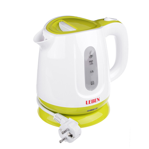 Leben надежный электрочайник мощностью 900 Вт в корпусе из качественного пластика. Прибор оснащен скрытым нагревательным элементом и позволяет вскипятить до 1 литр воды.