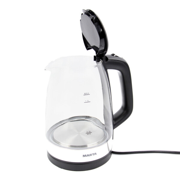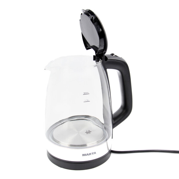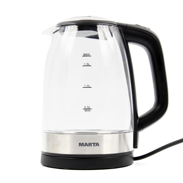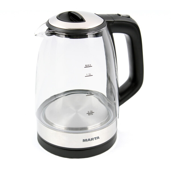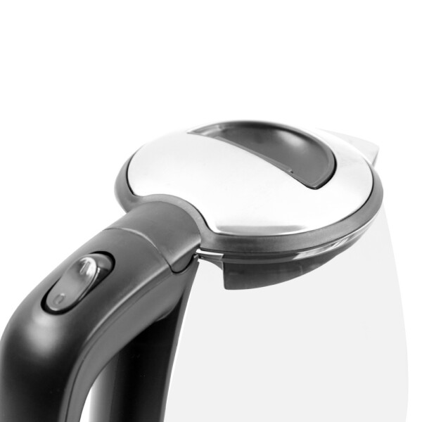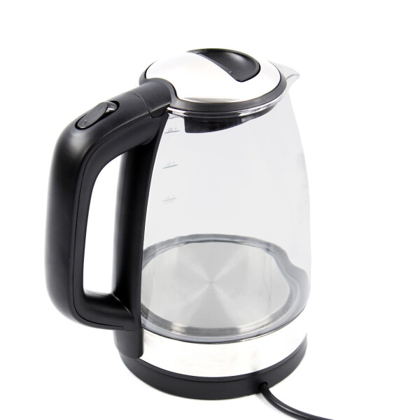 Современный, легкий и прочный чайник в элегантном корпусе из закаленного термостойкого стекла с голубой внутренней подсветкой и закрытым стальным нагревательным элементом.