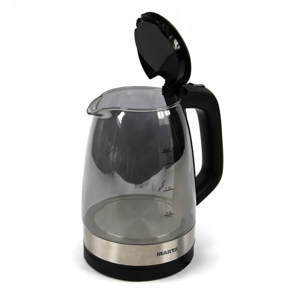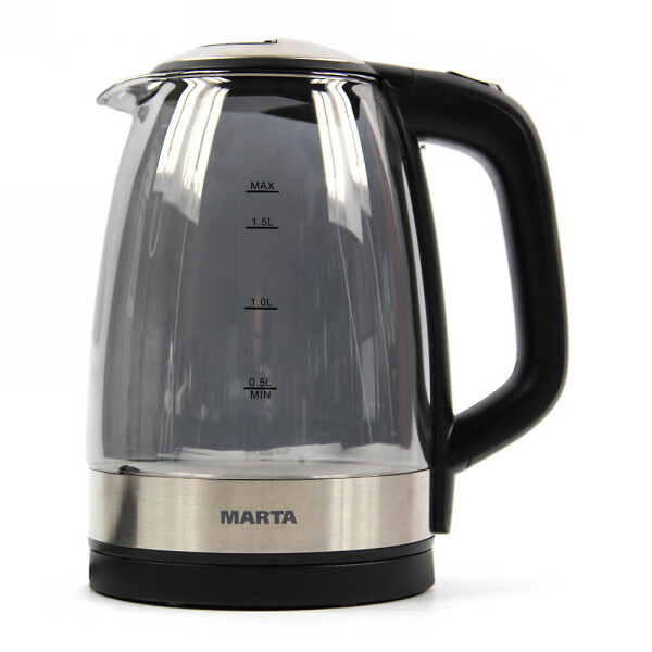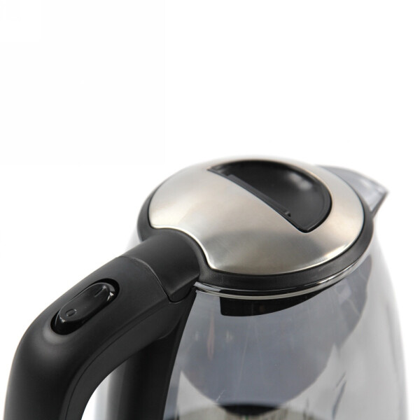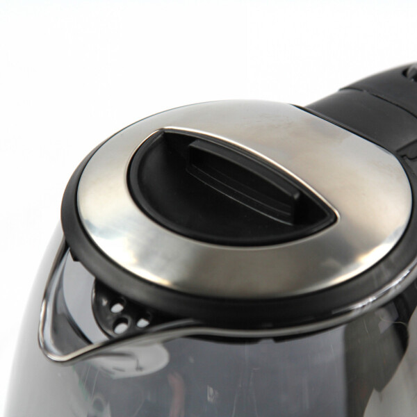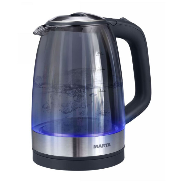 Современный, легкий и прочный чайник в элегантном корпусе из закаленного термостойкого стекла с голубой внутренней подсветкой и закрытым стальным нагревательным элементом.
