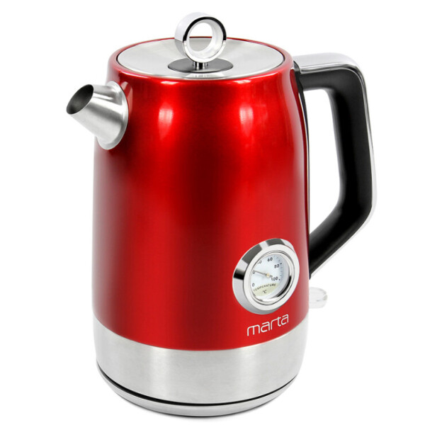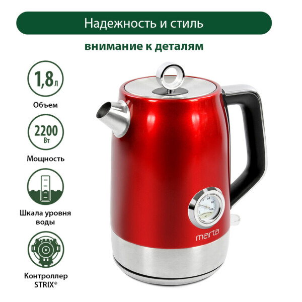 Вместительный металлический чайник объемом 1.8 литра из высококачественной нержавеющей стали. Пищевая нержавеющая сталь способствует сохранению природного вкуса и натуральных свойств воды. Для быстрого закипания чайник оснащен нагревательным элементом мощностью 2,2 к Ватт, защищенного плоским стальным дном для равномерности нагрева, противостояния накипи, коррозии и для большего удобства в уходе. Система автоматического отключения при закипании или недостаточном количестве воды заметно продлит срок работы чайника. Встроенный в чайник индикатор температуры позволяет контролировать текущую температуру воды. Чайник оснащен базой питания, позволяющей брать его с любой стороны или вращать на 360 градусов, что делает прибор совершенно безопасным, а его эксплуатацию комфортной.