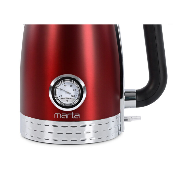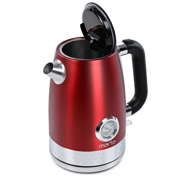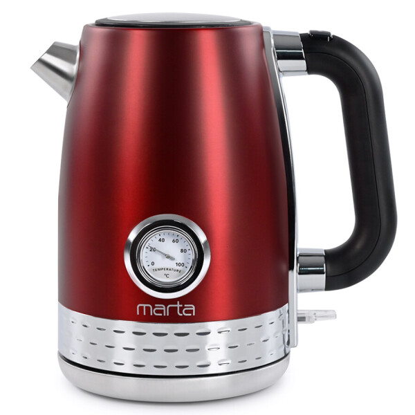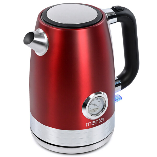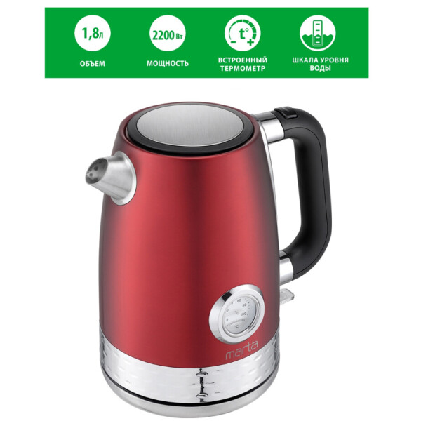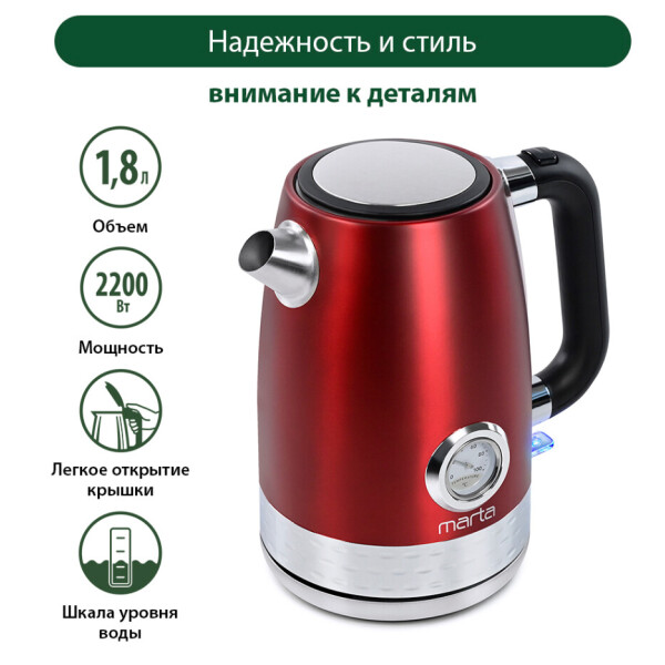 Вместительный металлический чайник объемом 1.8 литра из высококачественной нержавеющей стали. Пищевая нержавеющая сталь способствует сохранению природного вкуса и натуральных свойств воды. Для быстрого закипания чайник оснащен нагревательным элементом мощностью 2,2 к Ватт, защищенного плоским стальным дном для равномерности нагрева, противостояния накипи, коррозии и для большего удобства в уходе. Система автоматического отключения при закипании или недостаточном количестве воды заметно продлит срок работы чайника. Встроенный в чайник индикатор температуры позволяет контролировать текущую температуру воды. Чайник оснащен базой питания, позволяющей брать его с любой стороны или вращать на 360 градусов, что делает прибор совершенно безопасным, а его эксплуатацию комфортной.