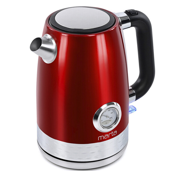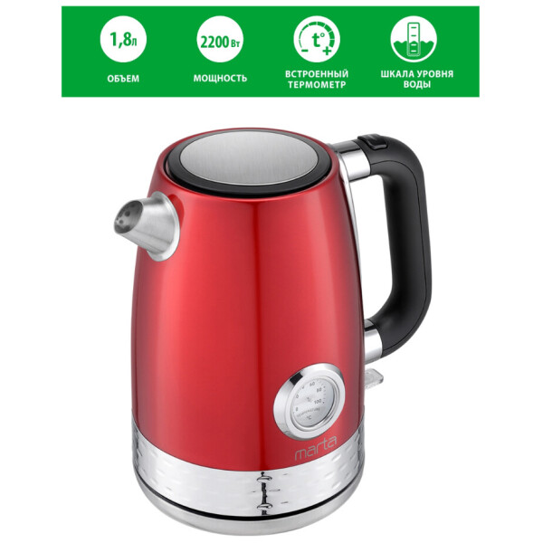 Вместительный металлический чайник объемом 1.8 литра из высококачественной нержавеющей стали. Пищевая нержавеющая сталь способствует сохранению природного вкуса и натуральных свойств воды. Для быстрого закипания чайник оснащен нагревательным элементом мощностью 2,2 к Ватт, защищенного плоским стальным дном для равномерности нагрева, противостояния накипи, коррозии и для большего удобства в уходе. Система автоматического отключения при закипании или недостаточном количестве воды заметно продлит срок работы чайника. Встроенный в чайник индикатор температуры позволяет контролировать текущую температуру воды. Чайник оснащен базой питания, позволяющей брать его с любой стороны или вращать на 360 градусов, что делает прибор совершенно безопасным, а его эксплуатацию комфортной.