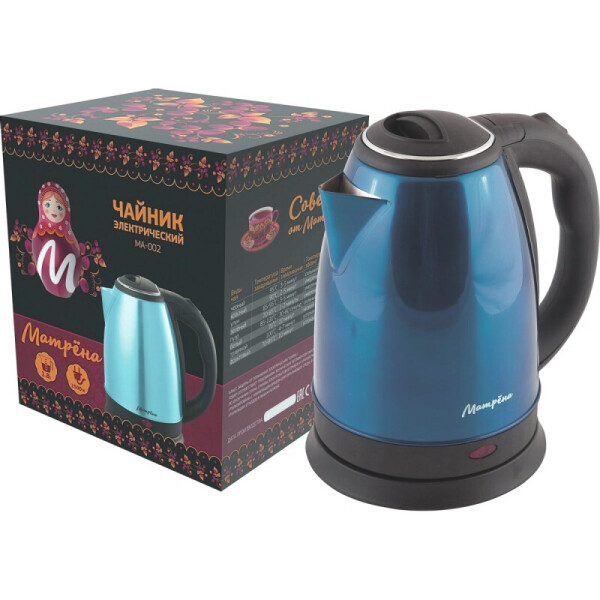 Чайник Матрёна электрический объемом 1, 8 л с корпусом из нержавеющей стали имеет мощность 1500 Вт. Прибор обладает системой автоотключения при закипании и защитой от работы без воды. Предусмотрена возможность поворота на подставке на 360 градусов. Чайник оснащен закрытым нагревательным элементом из нержавеющей стали, световым индикатором работы и местом для хранения шнура.