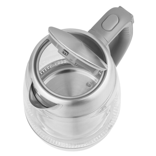 Колба чайника выполнена из жаропрочного боросиликатного стекла, которое с легкостью отмывается от любых пятен. Индикатор уровня воды нанесен непосредственно на стеклянную колбу. Автоматическое открывание крышки осуществляется кнопкой, расположенной в верхней части ручки. В носике крепится съемный фильтр, который легко достается и моется.