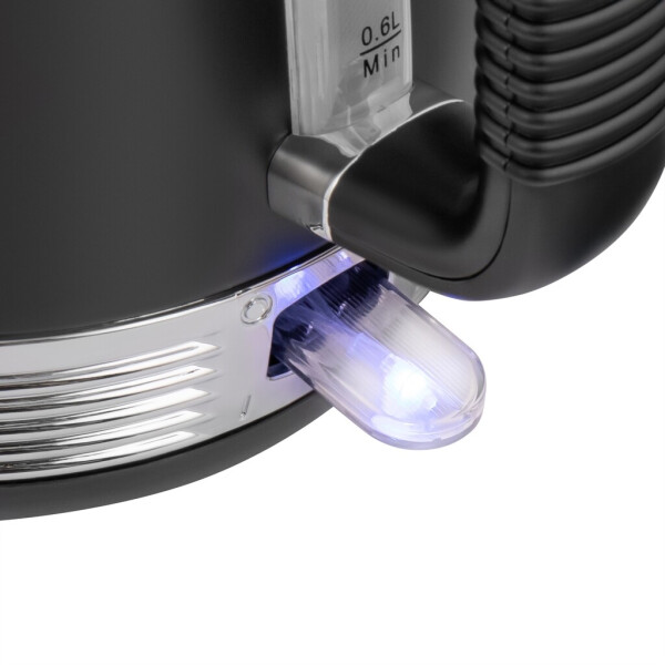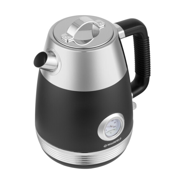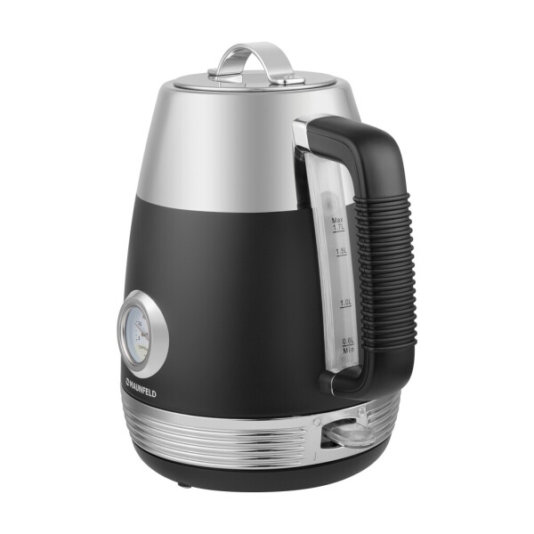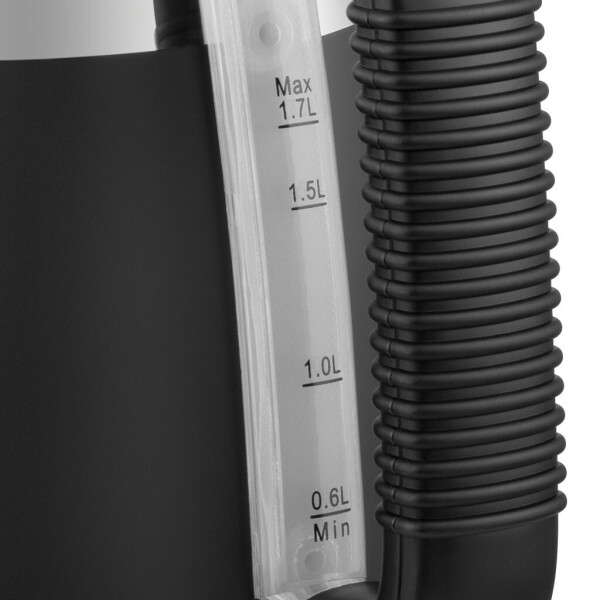 Максимальная мощность 2150Вт, электрическая сеть 220-240В/50Гц, объём 1.7л, вращение чайника на 360, нагревательный элемент закрытая спираль, система ручного открывания крышки, съёмный фильтр, индикация включения (свет) на переключателе, индикатор уровня воды, автоматическое/ ручное отключение: при закипании, указатель температуры воды, при снятии чайника с базы, при небольшом количестве воды.
