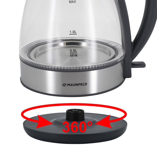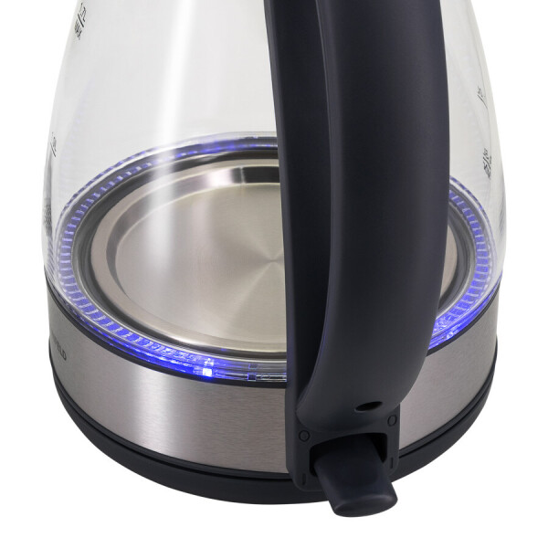 Чайник имеет светодиодную кольцевую подсветку вокруг нагревательного элемента, которая освещает всё стекло полностью во время нагревания/ кипячения воды.