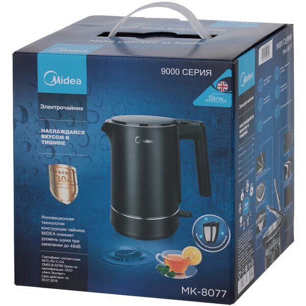 Чайник электрический Midea MK 8077 пригодится в городской квартире и загородном доме, в офисе и на даче. Это простая в использовании и надежная модель, в которой в качестве нагревательного элемента установлена скрытая спираль на 1800 Вт. Устройство быстро кипятит воду, а благодаря объему 1,5 л оно хорошо подходит для чаепития с кругу семьи, с коллегами по работе или друзьями.
