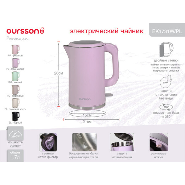 Электрический чайник EK1731W 1,7 л с двойными стенками, благодаря которым дольше сохраняет тепло внутри и меньше нагревается снаружи. Внутренняя часть изготовлена из высококачественной пищевой нержавеющей стали, включая крышку, внешняя из термостойкого пластика. Модель оснащена удобным фильтром, который не позволит накипи попасть в чашку. Благодаря отсутствию швов в металлической колбе чайник защищен от протеканий. Корпус чайника свободно вращается на 360 градусов, что гарантирует удобство в эксплуатации.