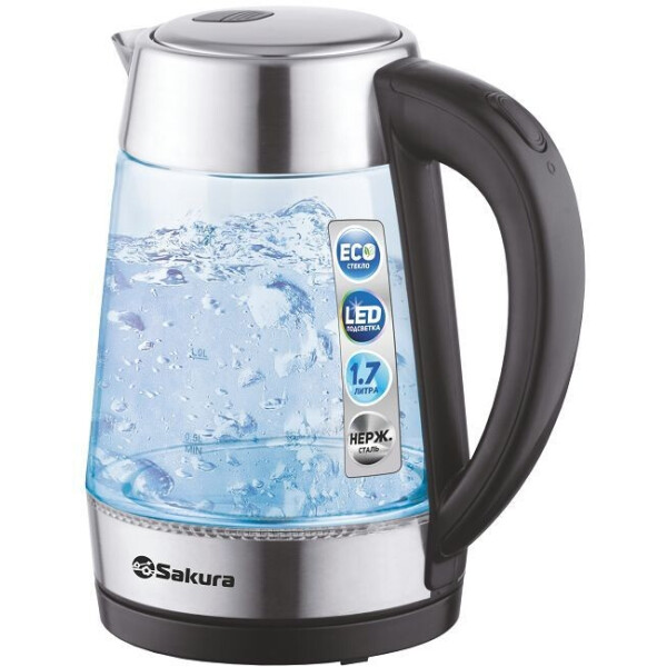 1,7 л, 1850-2200 Вт, стеклянный корпус, диск, вращение на 360, подсветка, отключение при закипании и включении без воды.