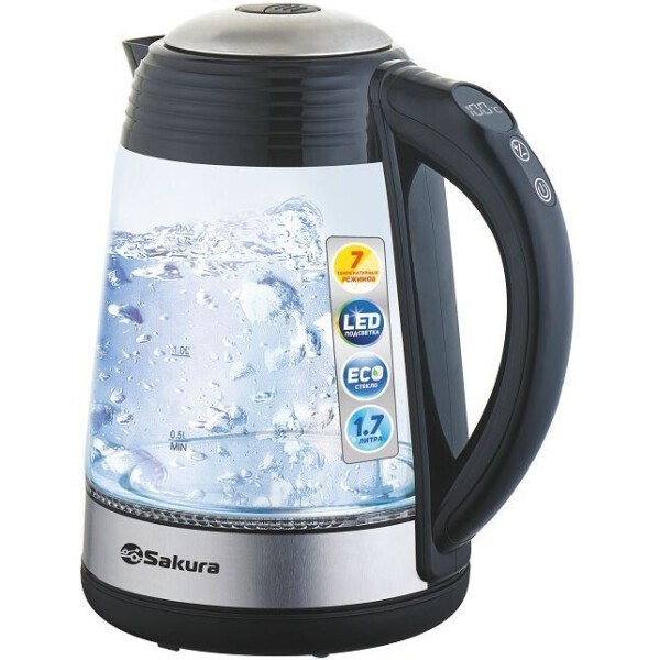 Стеклянный корпус, диск, LED дисплей, 7 температурных режимов (40,50, 60, 70, 80, 90, 100С), 6 цветов подсветки воды, поддержание температуры в течение 1 часа, вращение на 360, отключение при закипании и включении без воды.