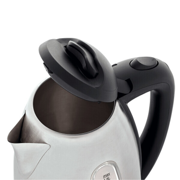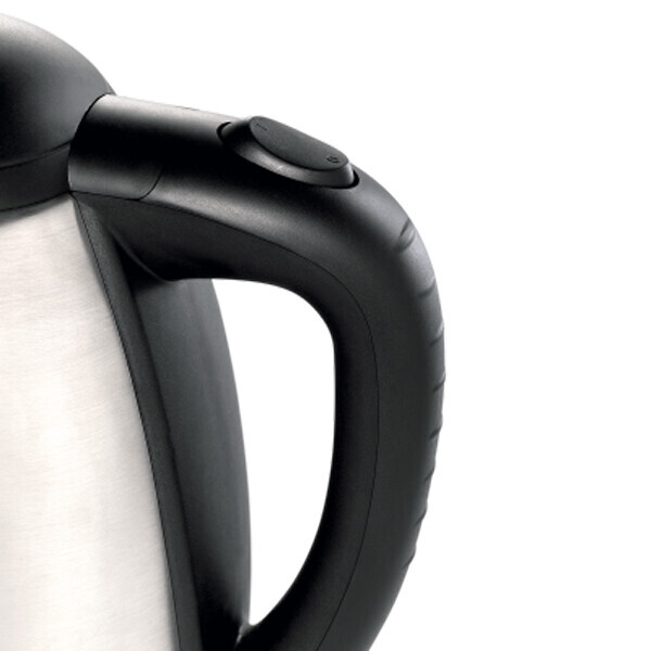 Чайник из нержавеющей стали имеет округлые формы и удобную массивную ручку с расположенным на ней выключателем. Откидывающаяся крышка из пластика полностью защелкивается и не дает воде проливаться даже в процессе кипения. Широкое прозрачное окошко сбоку оснащено шкалой с уровнем.
