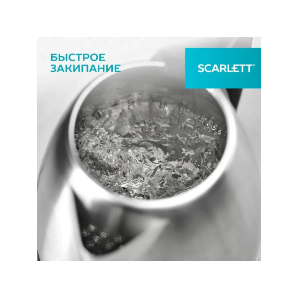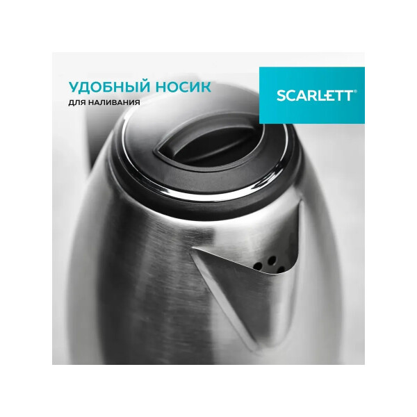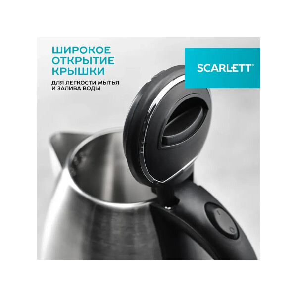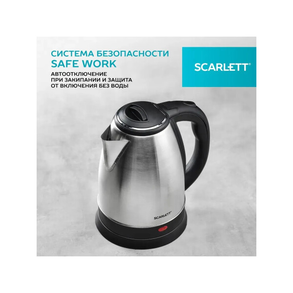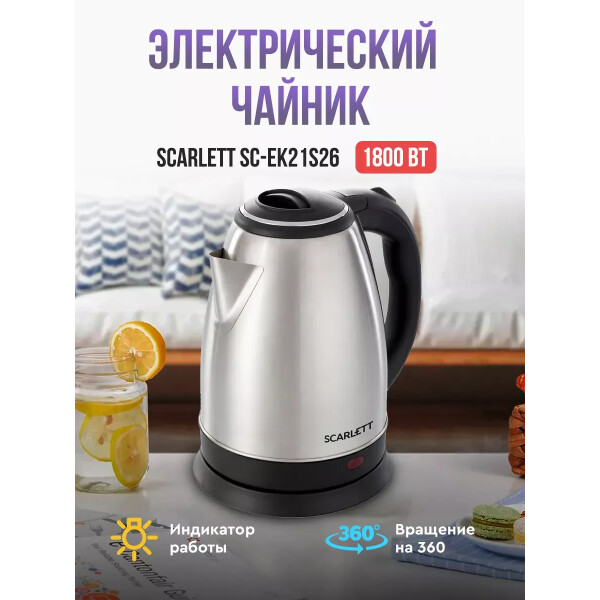 Модель Scarlett SC-EK21S26 дополнена визуально понятной индикацией работы и возможностью свободного вращения на подставке. Чайник весит 0.8 кг и обладает габаритами 18x23x19 см. Предусматривается наличие блокировки включения и функции автоотключения при закипании. Чайник дополнен эргономичной ручкой для удобного открытия крышки и отсеком в подставке для хранения шнура.