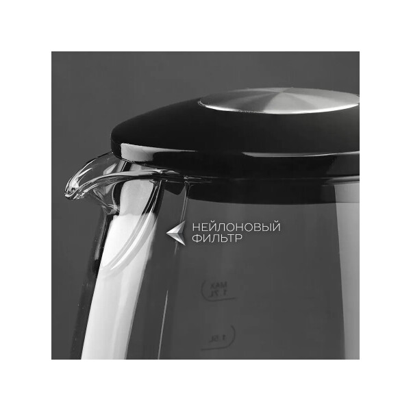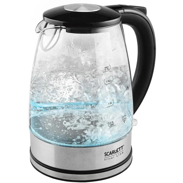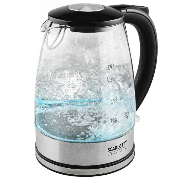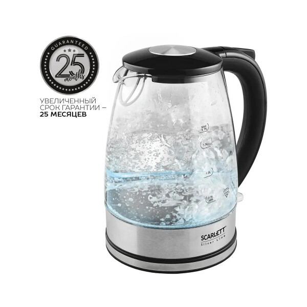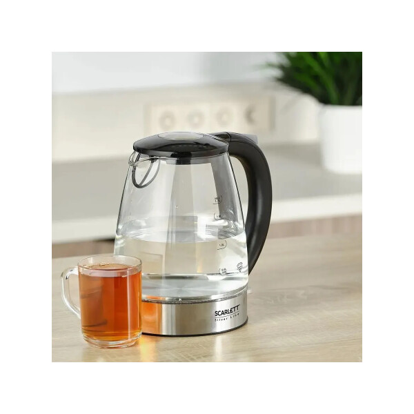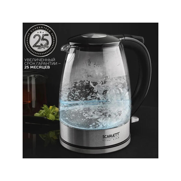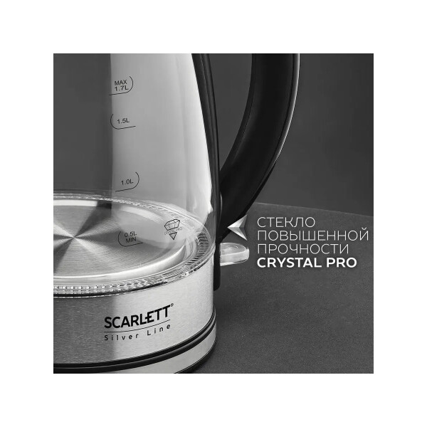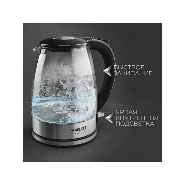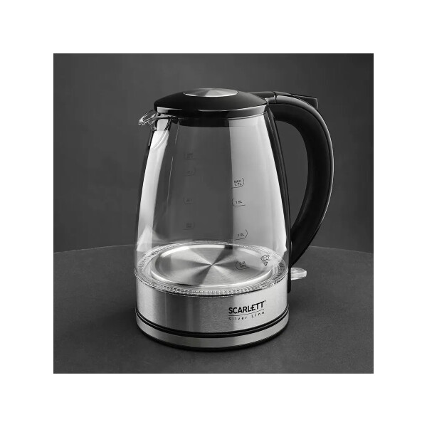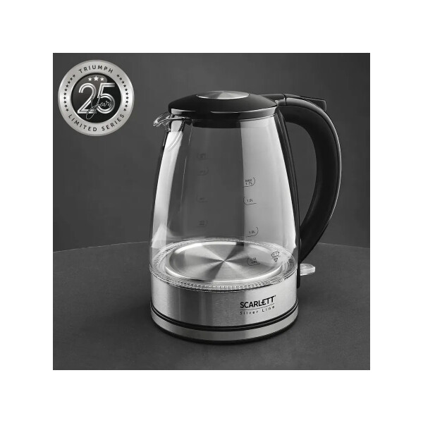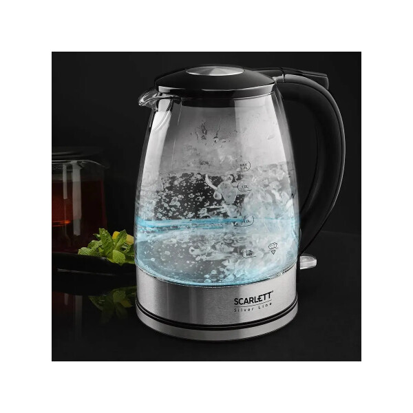 Чайник Scarlett SC-EK27G95 привлекает внимание изящной формой, плавными линиями, благородным контрастом черного цвета и металлической декорации.