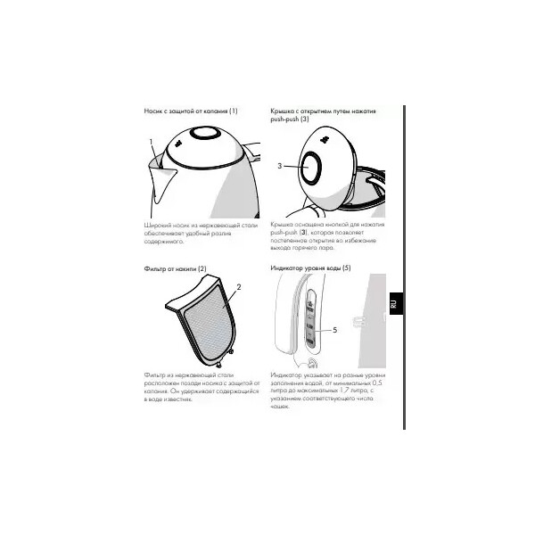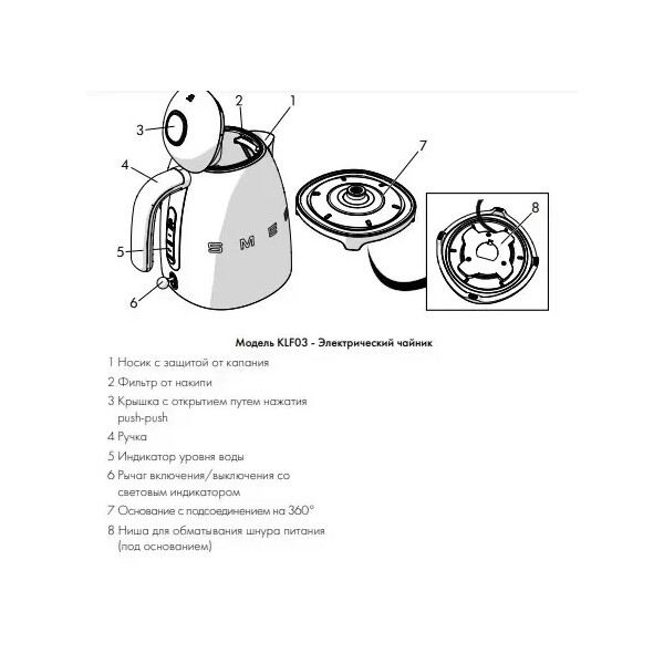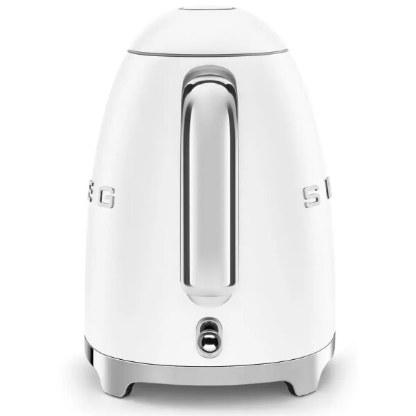 Чайник электрический Smeg KLF03WHMEU предназначен для нагрева и кипячения питьевой воды. Он относится к серии Стиль 50х годов, имеет корпус из нержавеющей стали и привлекательный внешний вид в цвете матовый белый. Прибор способен не только справиться со своими функциями, но и стать настоящим украшением вашей кухни. При закипании воды до 100С и при снятии чайника с базы происходит автоматическое выключение. В базе есть отделение для хранения шнура, возможность поворота на 360. Также в комплект входит съемный моющийся фильтр из нержавеющей стали. Устойчивость прибора на поверхности гарантируют нескользящие ножки.