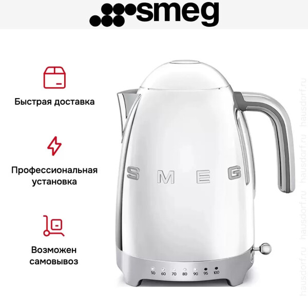 Электрический чайник Smeg KLF04SSEU имеет возможность регулировки температуры в пределах от 50 до 100°С. Прибор автоматически выключает в случае снятия с базы, а также при достижении температуры в 100°С. Корпус модели выполнен из отполированной нержавеющей стали, что придает чайнику определенный стиль. В базе предусмотрен отсек для хранения шнура.