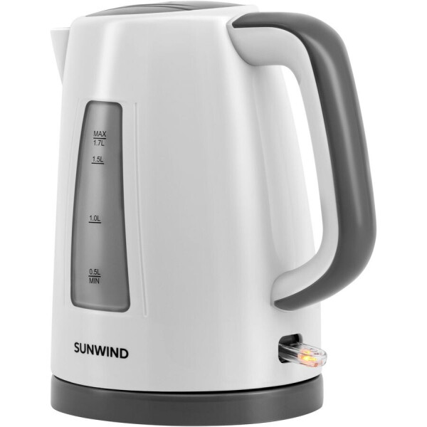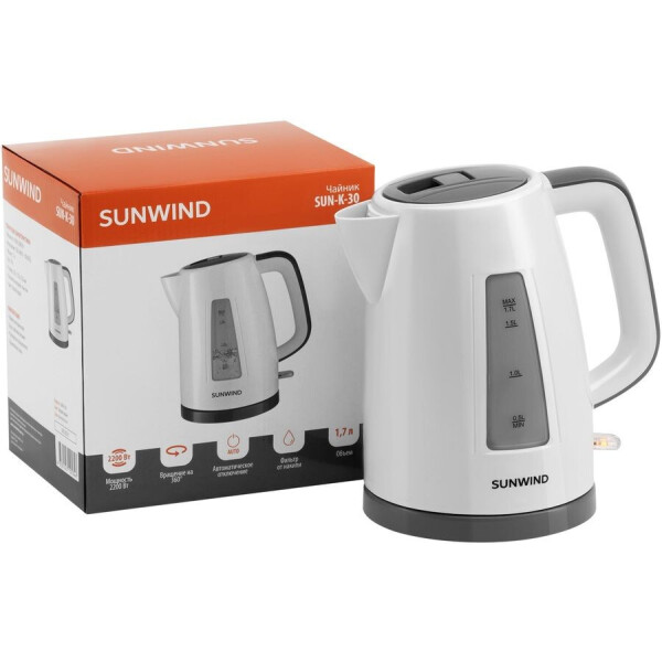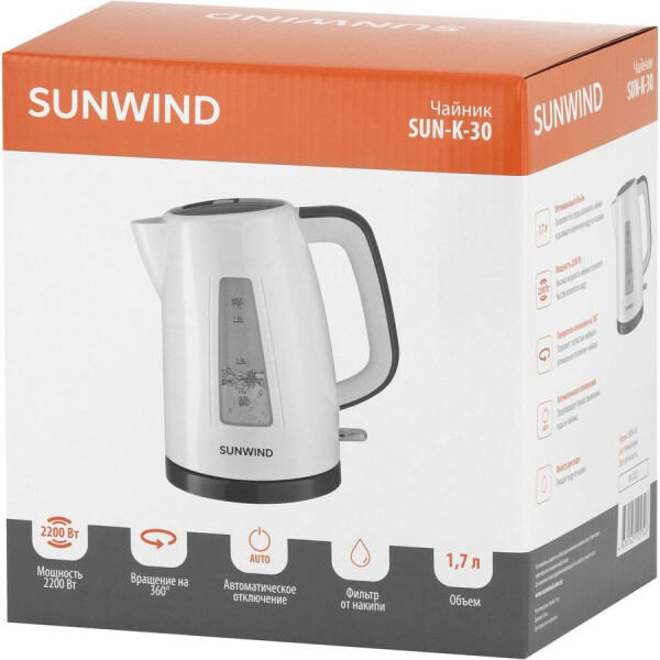 Электрический чайник Sunwind SUN-K-30 способен за несколько минут вскипятить жидкость объемом 1,7 литра. Его мощность составляет 2200 Вт. Корпус чайника изготовлен из безопасного пищевого пластика. Нагревательный элемент скрытый. Предусмотрены и другие элементы безопасности: автоматическое выключение, блокировка включения, когда в чайнике нет воды. Также присутствуют индикаторы включения и уровня воды, фильтр от накипи, кнопка открытия крышки. Подставка вращается на 360 градусов, и в ней есть место для хранения шнура.