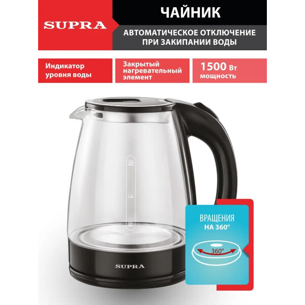 Чайник электрический Supra KES-1870G чайник с прочным корпусом из стекла. Это вместительная модель, рассчитанная на 1,8 л. Её можно использовать дома, на даче или в офисе для чаепитий с родственниками, друзьями и коллегами.