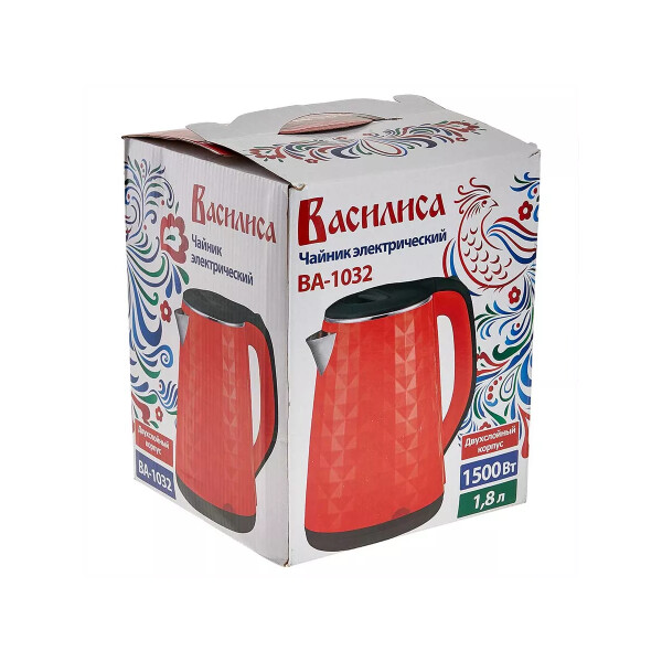 Электрический чайник ВАСИЛИСА ВА-1032 пластик двойная стенка красный 2000 Вт, 1.8 л Р1-00004496 предназначен для использования в офисе или дома.
