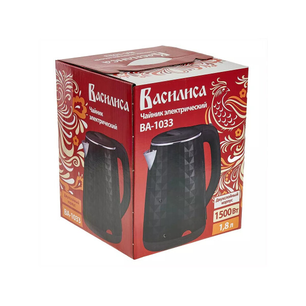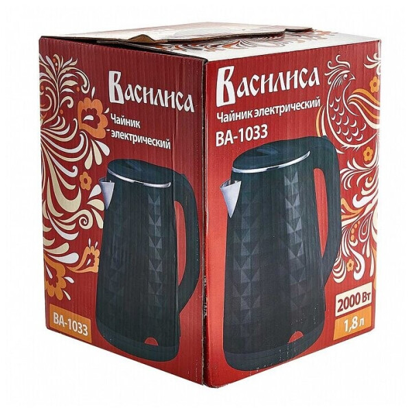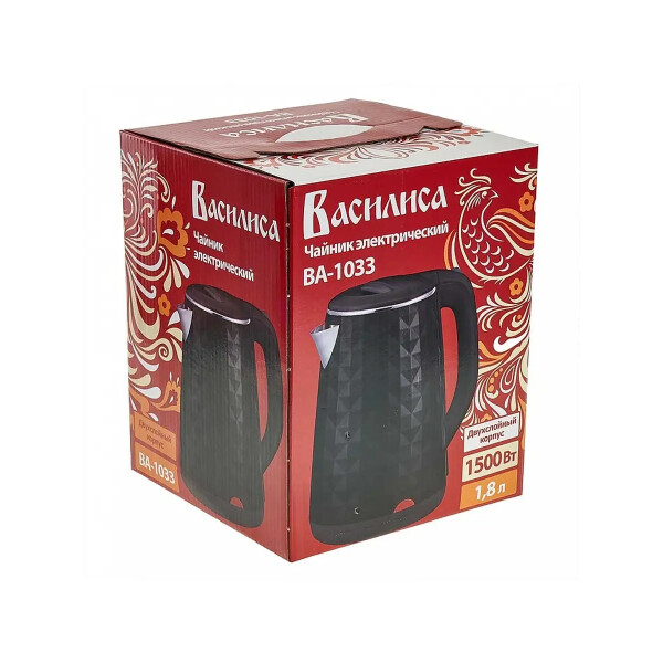 Электрический чайник ВАСИЛИСА ВА-1033 пластик двойная стенка черный 2000 Вт, 1.8 л Р1-00004497 предназначен для использования в офисе или дома.