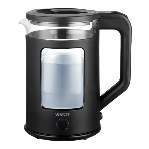 Чайник электрический черного цвета. Автоматическое отключение при отсутствии воды. Автоматическое отключение при закипании. Световой индикатор работы. Вращение базы на 360. Тип нагревательного элемента - скрытый.