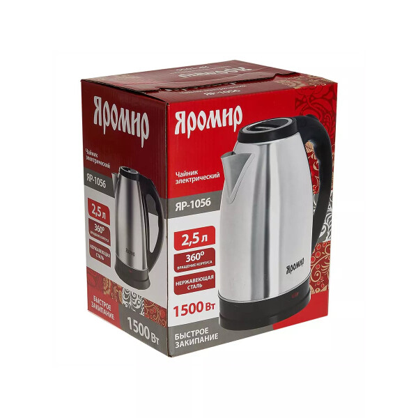 Чайник электрический Яромир ЯР-1056. Корпус из высококачественной нержавеющей стали с глянцевой полировкой. Автоотключение при закипании. Защита от работы без воды. Закрытый нагревательный элемент из нержавеющей стали. Возможность поворота на подставке на 360 градусов. Мощность 2000Вт, объём 2,5л.