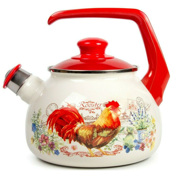 Чайник Золотой петушок изготовлен из стали с эмалированным покрытитем. Яркий и красочный рисунок долговечен, создаст уют и тепло в вашем доме. Стеклоэмаль инертна и устойчива к пищевым кислотам, не вступает во взаимодействие с продуктами и не искажает их вкус. Эмалевое покрытие, являясь стекольной массой, не вызывает аллергию и надежно защищает пищу от контакта с металлом. Долговечна и проста в уходе. Оно устойчиво к механическому воздействию, не царапается и не ''сходит'', а стальная основа не подвержена механической деформации, благодаря чему, срок эксплуатации увеличивается. Элегантный и современный дизайн изделия отлично смотрится в разнообразных по стилю и интерьеру кухнях. Подходит для всех видов плит. Не рекомендуется использовать в духовом шкафу. Можно мыть в посудомоечной машине.