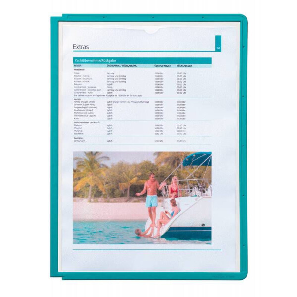 Демонстрационная панель DURABLE Sherpa изготовлена из прозрачного полипропилена с зеленной пластиковой окантовкой. Применяется для демонстрации и ознакомления с документами, листовками, пресс-релизами и другой печатной информацией на напольных, настенных или настольных стендах. Используется в воспитательных и учебных заведениях, в общественных приемных, на презентациях и других местах массового посещения. Зеленная демопанель DURABLE Sherpa применяется для размещения бумажных носителей формата А4. Сформированная в виде перекидного блокнота или перелистываемой книги данная панель не требует много места, позволяя поместить значительное количество листовок, документов, пресс-релизов или рекламных буклетов на небольшом пространстве.