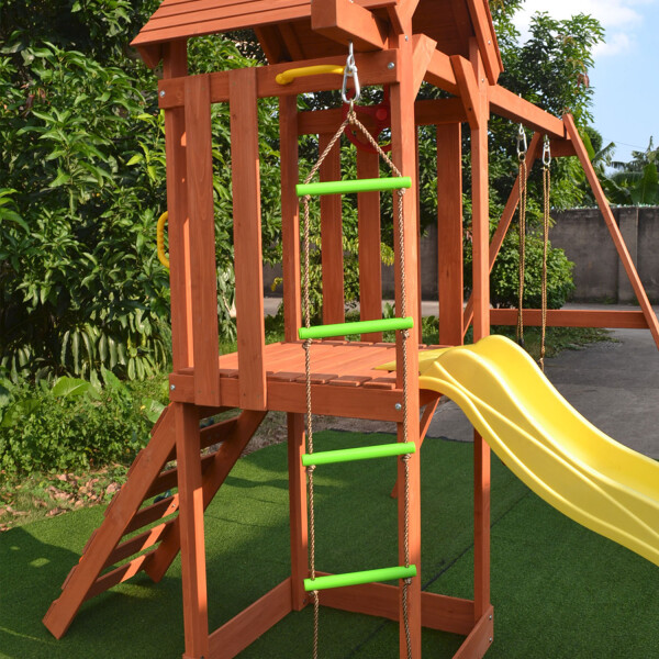 Центральная часть комплекса представлена небольшим домиком - башней под деревянной крышей. Нижний ярус можно использовать под небольшую песочницу.