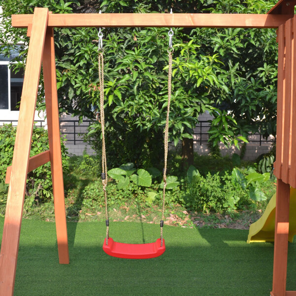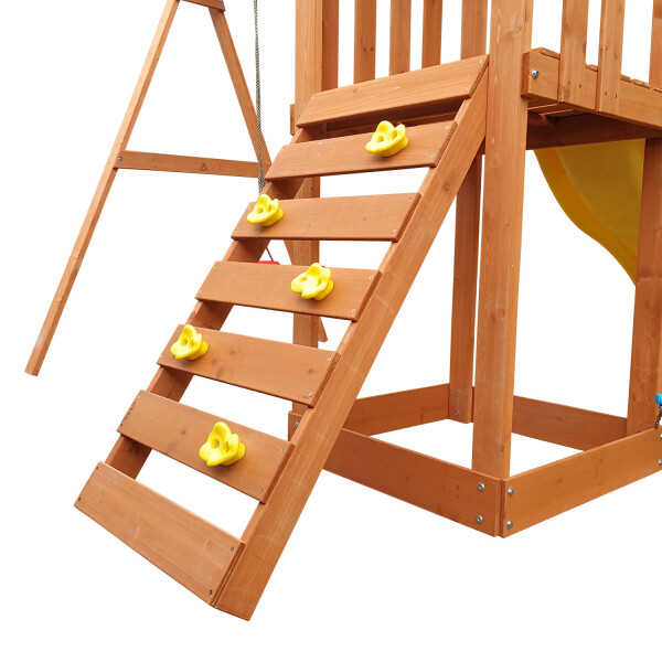 Дополнительными элементами для развлечений служат одиночные качели и веревочная лесенка. Качели на боковой части комплекса имеют надежное подвесное крепление. Скалодром с 5-ю камнями - зацепами поможет развить ловкость.
