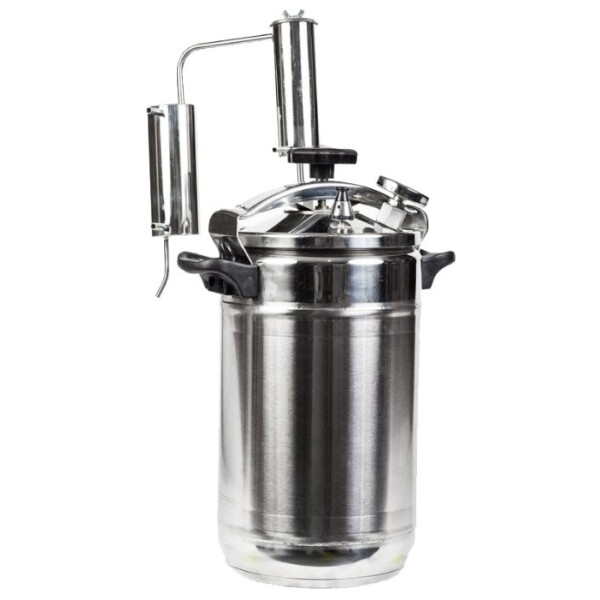 Такая модель подойдет даже новичкам, так как процесс дистилляции проходит полностью автоматически. Объем бака в этом устройстве равен 20 л. Дистиллятор оборудован термометром, что дает возможность легко контролировать процесс. В конструкции предусмотрен клапан сброса избыточного давления. Съемная крышка упрощает процесс очистки устройства после использования.