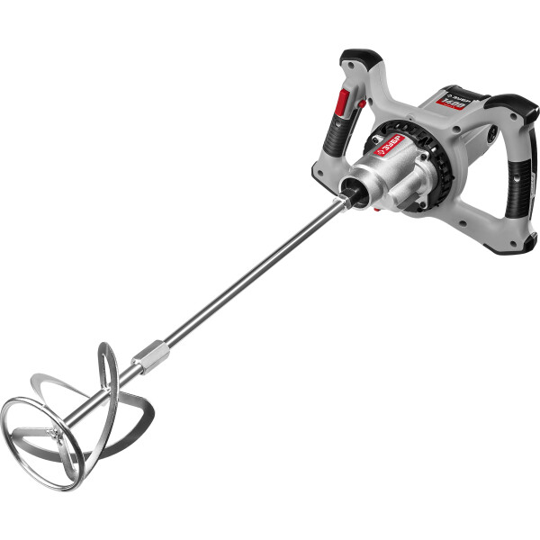 Ручной миксер Зубр МР-1400-2 для перемешивания компонентов (сухой смеси и жидкости) при получении различных строительных и отделочных материалов (бетона, штукатурки, плиточных и обойных клеев, дисперсных красок и т.д.).