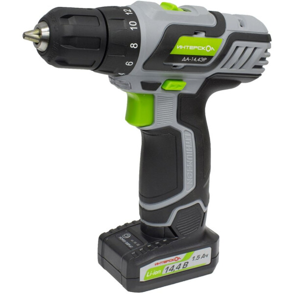 Компактная и легкая двухскоростная дрель-шуруповерт серии «Домашний мастер» с удобным современным литий-ионным аккумулятором номинальным напряжением 14,4 В емкостью 1,5 А∙ч. Модель имеет яркую светодиодную подсветку рабочей зоны и двухскоростной редуктор с металлическими шестернями, который позволяет уверенно сверлить отверстия в различных материалах и эффективно работать с крепежными элементами резьбовых соединений. Дрель-шуруповерт оснащается одномуфтовым быстрозажимным сверлильным патроном, что в совокупности с автоматической блокировкой шпинделя значительно упрощает и ускоряет замену оснастки. Муфта ограничения предельного момента («трещотка») с 18+1 позициями регулировки позволяет точно настроить усилие затяжки при серийном закручивании крепежа.