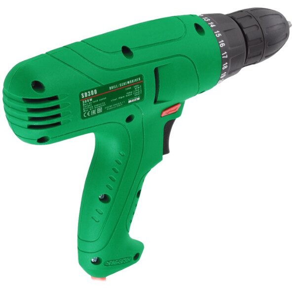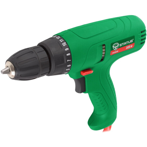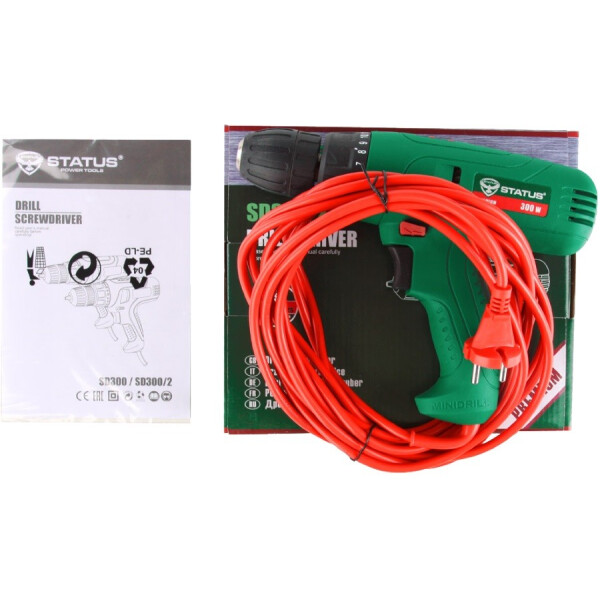 STATUS SD-300 Бытовая дрель-шуруповёрт предназначена для сверления в разнообразных материалахи работы с шурупами и саморезами. Дрель сетевая односкоростная, рукоятки не обрезинены, длина сетевого шнура 6 м. Есть функция реверса, выключатель может фиксироваться для длительной работы. Электронная регулировка оборотов позволяет получить более эффективное сверление и работу с разными видами метизов, муфта имеет регулировку по 20 позициям. Используется быстрозажимный патрон.