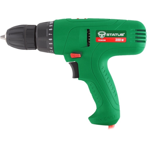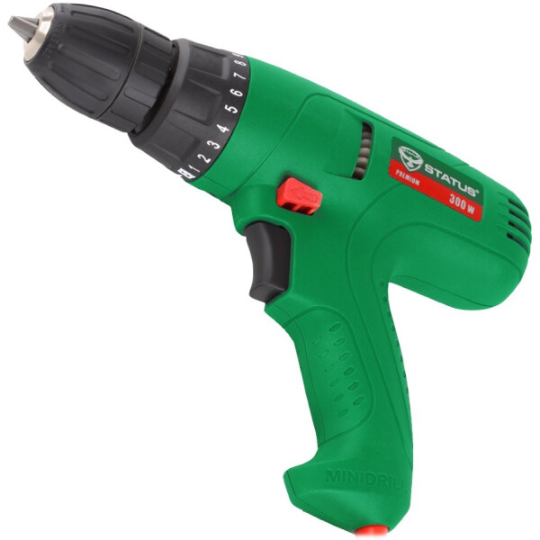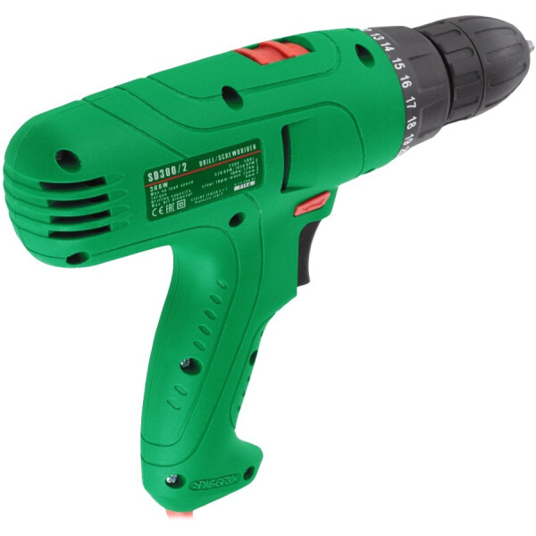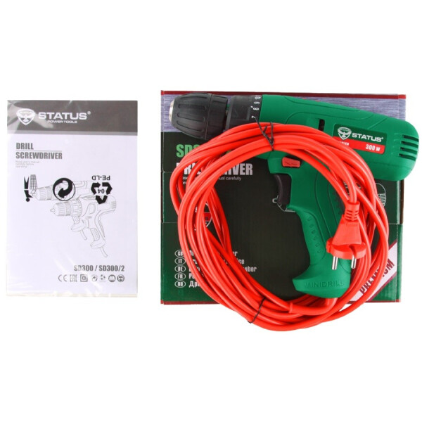 STATUS SD-300/2 Бытовая дрель-шуруповёрт предназначена для сверления в разнообразных материалах и работы с шурупами и саморезами. Дрель сетевая двухскоростная, рукоятки не обрезинены, длина сетевого шнура 6 м. Есть функция реверса, выключатель может фиксироваться для длительной работы. Электронная регулировка оборотов позволяет получить более эффективное сверление и работу с разными видами метизов, муфта имеет регулировку по 20 позициям. Используется быстрозажимный патрон.