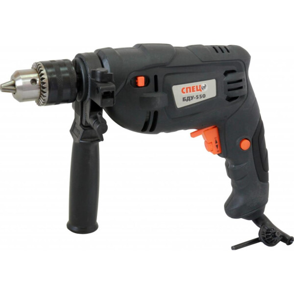 Дрель Спец БДУ-550, оснащенная ключевым патроном, подходит для сверления отверстий в изделиях и поверхностях из дерева, металла, камня, бетона, пластмассы и других материалов. Инструмент экономичен: потребляемая мощность устройства составляет 550 Вт. Максимальная частота оборотов холостого хода модели равна 2800 в минуту. Инструмент обладает возможностью работы в 2 режимах: сверления и сверления с ударом. Режим ударного сверления особенно полезен при работе с твердыми основаниями. Преимуществом дрели является возможность регулировки оборотов.