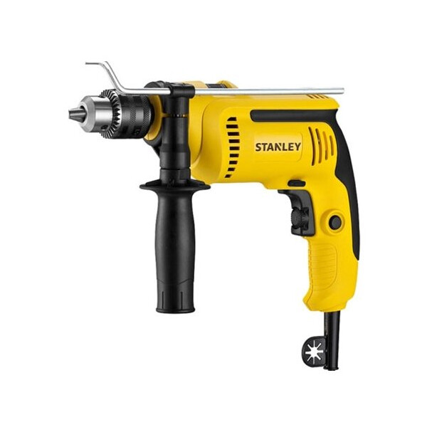 Ударная дрель Stanley SDH700C снабжена быстрозажимным патроном, благодаря чему смена оснастки не занимает много времени. В зависимости от плотности материала можно подобрать нужную скорость работы с помощью регулировочного колесика на пусковой кнопке. Предусмотрена функция реверса, которая помогает извлечь сверло при заклинивании. В комплект входит глубиномер, при помощи которого оператор визуально отслеживает длину высверливаемого канала.