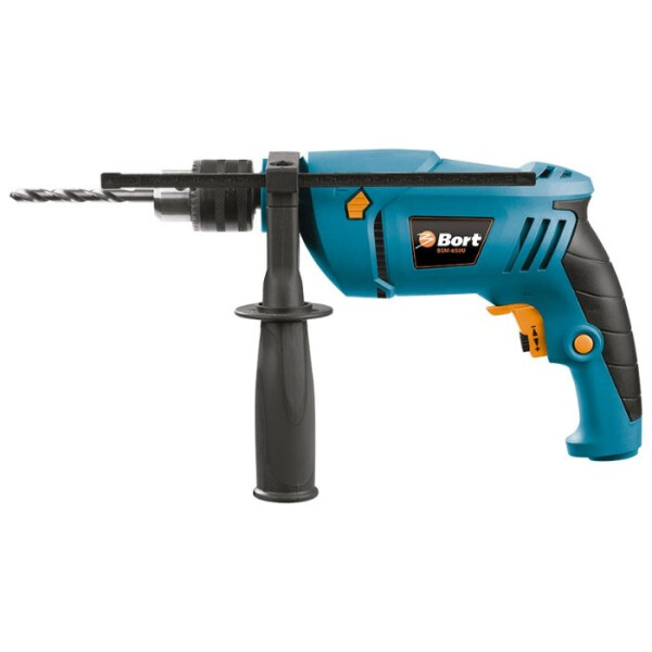 Ударная дрель Bort BSM-650U – лучший инструмент для сверления различных отверстий в любых материалах. Конструкция механизма такова, что при фронтальной подаче происходят поступательные удары по сверлу, за счет чего на порядок увеличивается эффективность и производительность, особенно при работе с такими материалами, как бетон или металл. В минуту шпиндель Bort BSM-650U вращается три тысячи раз, благодаря чему само сверление происходит достаточно быстро. В быстрозажимной патрон можно устанавливать сверла диаметром до 13 мм. Возможность заблокировать кнопку включения предотвратит случайный запуск инструмента, а реверсивная подача упростит выход сверла из сложного отверстия. Отличительная особенность этой модели – наличие дополнительной рукоятки с отсеком для сверел. Это будет полезно при использовании нескольких диаметров насадок одновременно. Для самостоятельного обслуживания в комплекте поставляются щетки на двигатель, которые устанавливаются в случае поломки или износа.