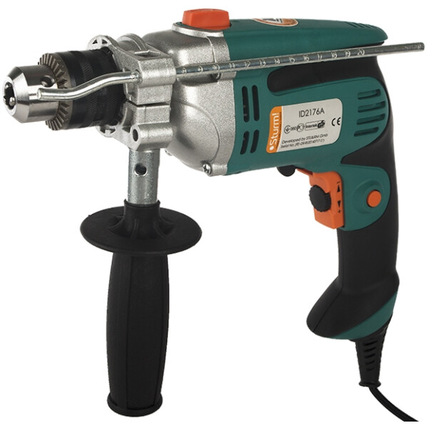 Ударная дрель Sturm ID2176A снабжена двигателем мощностью 750 Вт. Ключевой патрон был и остается самым надежным для работы, особенно с ударными дрелями. Оснастка крепко зажимается и не подводит в самый ответственным момент. Ограничитель глубины обеспечивает сверление отверстий на заданную глубину. Металлический корпус редуктора гарантирует долгий срок службы. Благодаря дополнительной рукоятке, дрель легко удерживать во время работы.